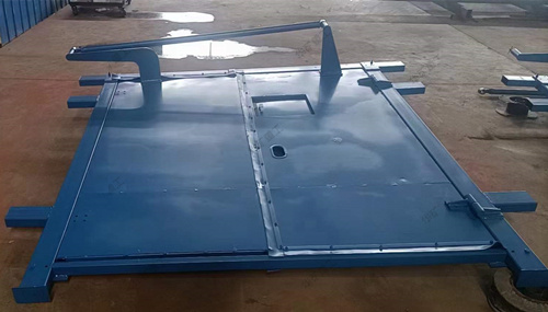 礦用無(wú)壓風(fēng)門適用于煤礦井下巷道任何需要安設(shè)風(fēng)門的地點(diǎn)。無(wú)壓風(fēng)門采用壓力平衡原理,每道風(fēng)門為雙扇鋼制門框異向同步開閉,運(yùn)用聯(lián)桿平衡機(jī)構(gòu)把作用在風(fēng)門上的壓力通過(guò)聯(lián)桿平衡機(jī)構(gòu)轉(zhuǎn)化為一種內(nèi)力并得到平衡,保證了風(fēng)門打開時(shí)省力、方便靈活。由于壓力平衡式風(fēng)門為異向開閉,因此無(wú)論風(fēng)流方向如何,兩扇門均同時(shí)受到風(fēng)流的推力和風(fēng)流的壓力,而且大小相等。另外在門框橫梁上的風(fēng)門開啟方向的異側(cè),焊接擋板確保風(fēng)流反向時(shí)風(fēng)門不被吹開。同時(shí)通過(guò)配重塊產(chǎn)生的牽引力實(shí)現(xiàn)風(fēng)門自動(dòng)關(guān)閉。